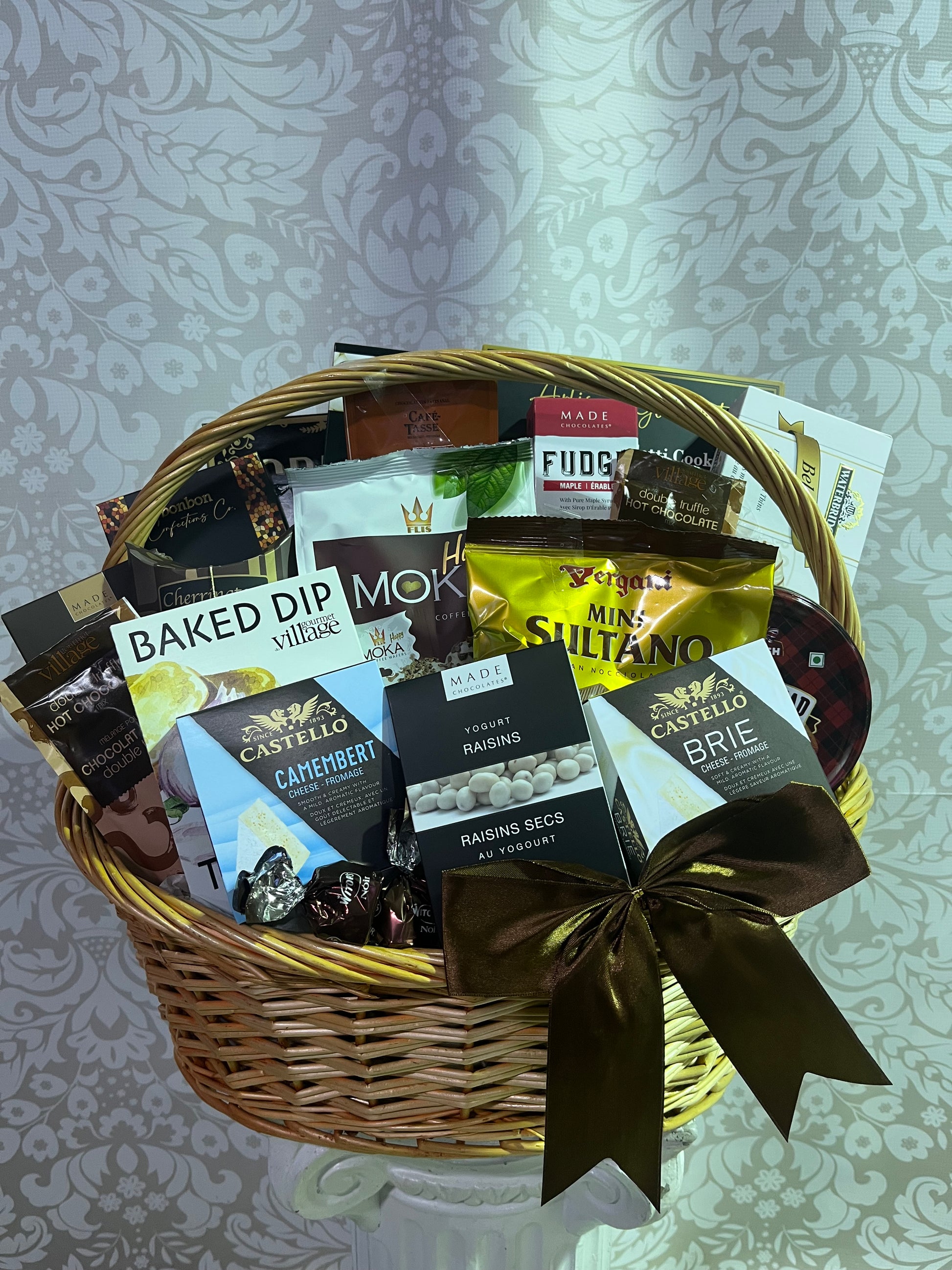 Que la fête commence. Idéal pour le partage. Cet énorme panier-cadeau comprend un assortiment de fromages, du saumon fumé, des craquelins, des noix, du fudge, du caramel, des chocolats et bien plus encore.