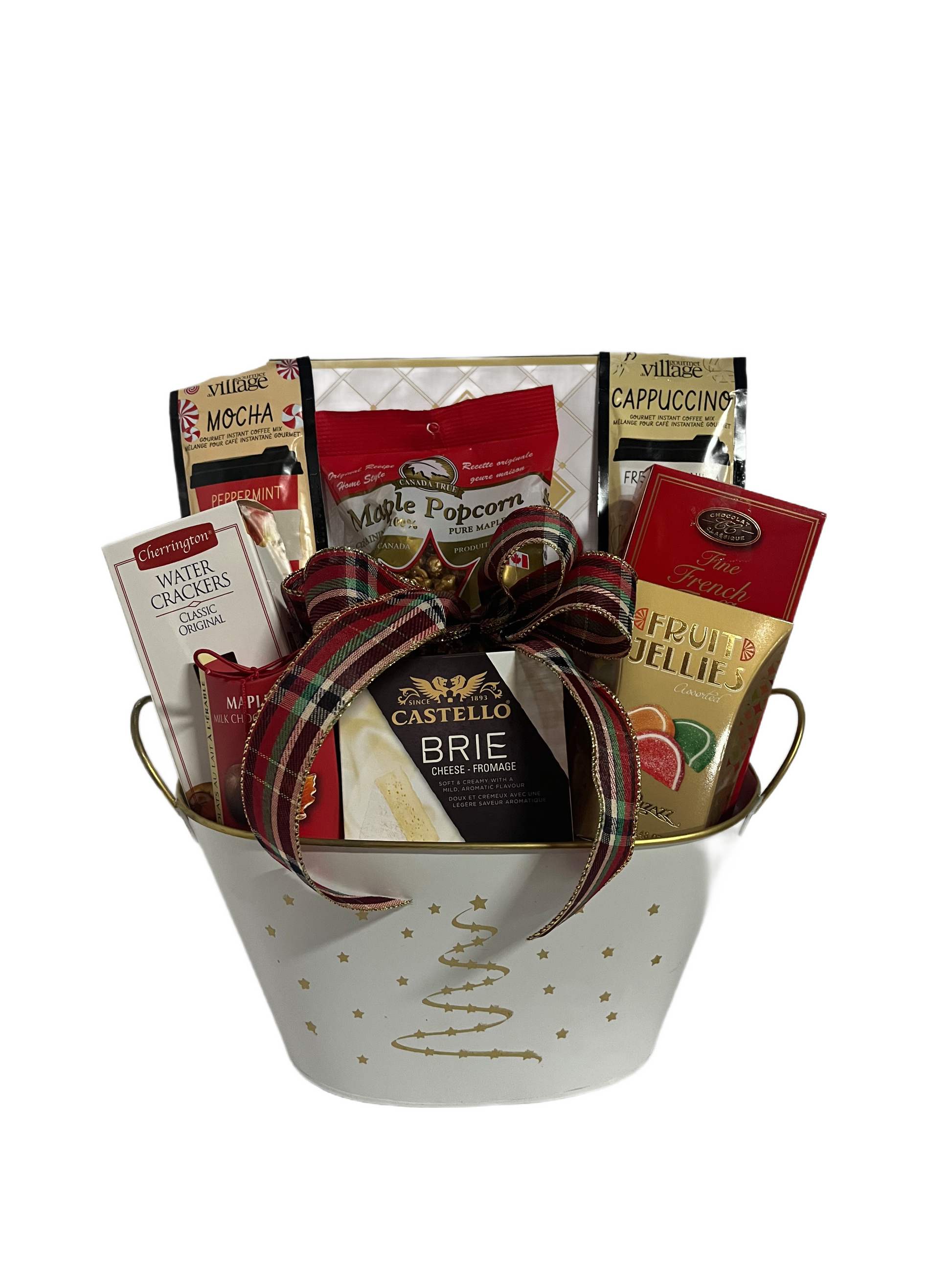 Piled high with treats that are sure to please. French truffles, crackers, Brie cheese, Sugar cookies, caramel popcorn , candy,drink mixed and