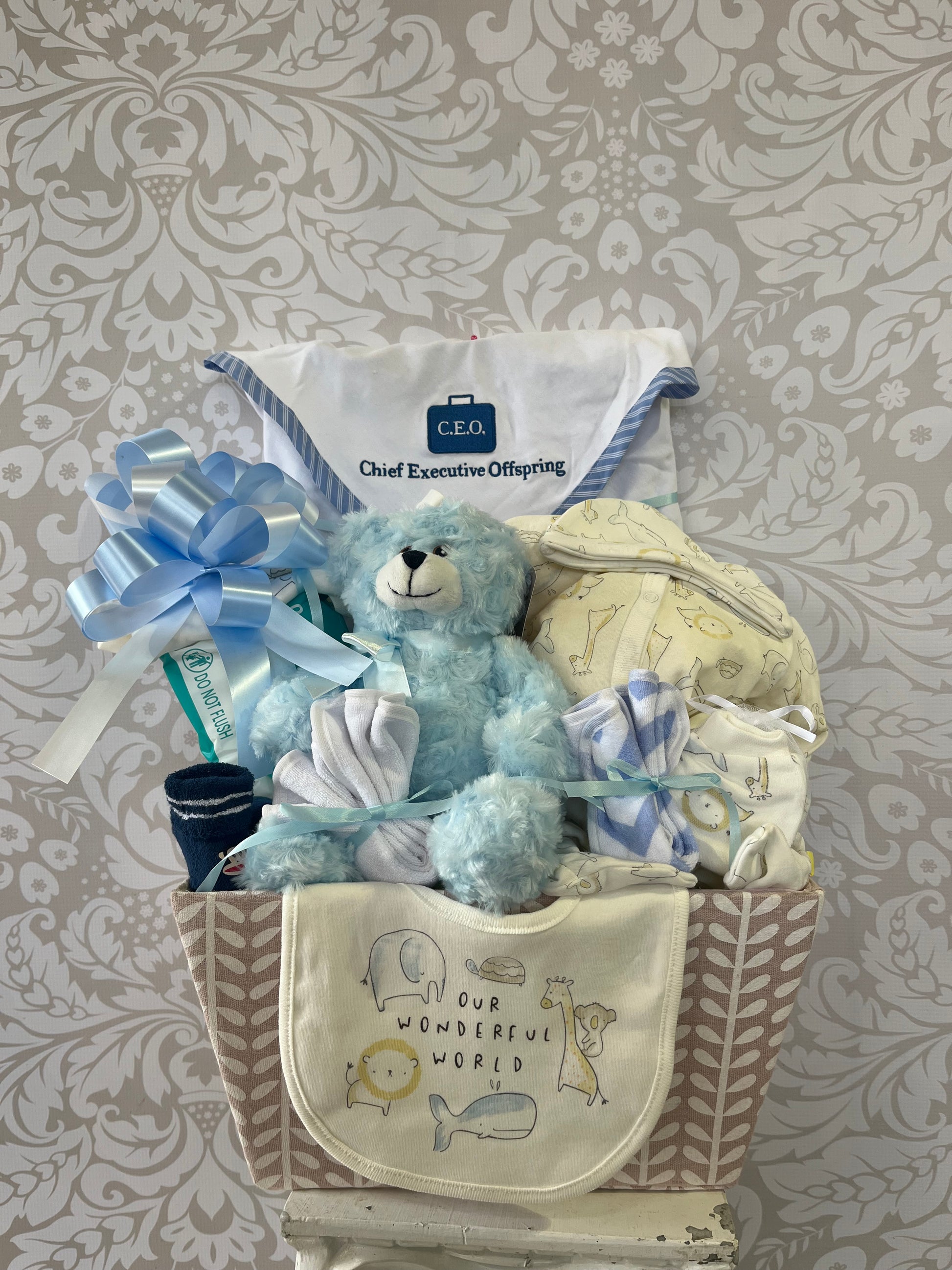 This pretty gift box is piled high with useful gifts for new baby. A quality outfit, bib, socks, wipes, face clothes, big receiving blanket and a cuddly stuffed bear.