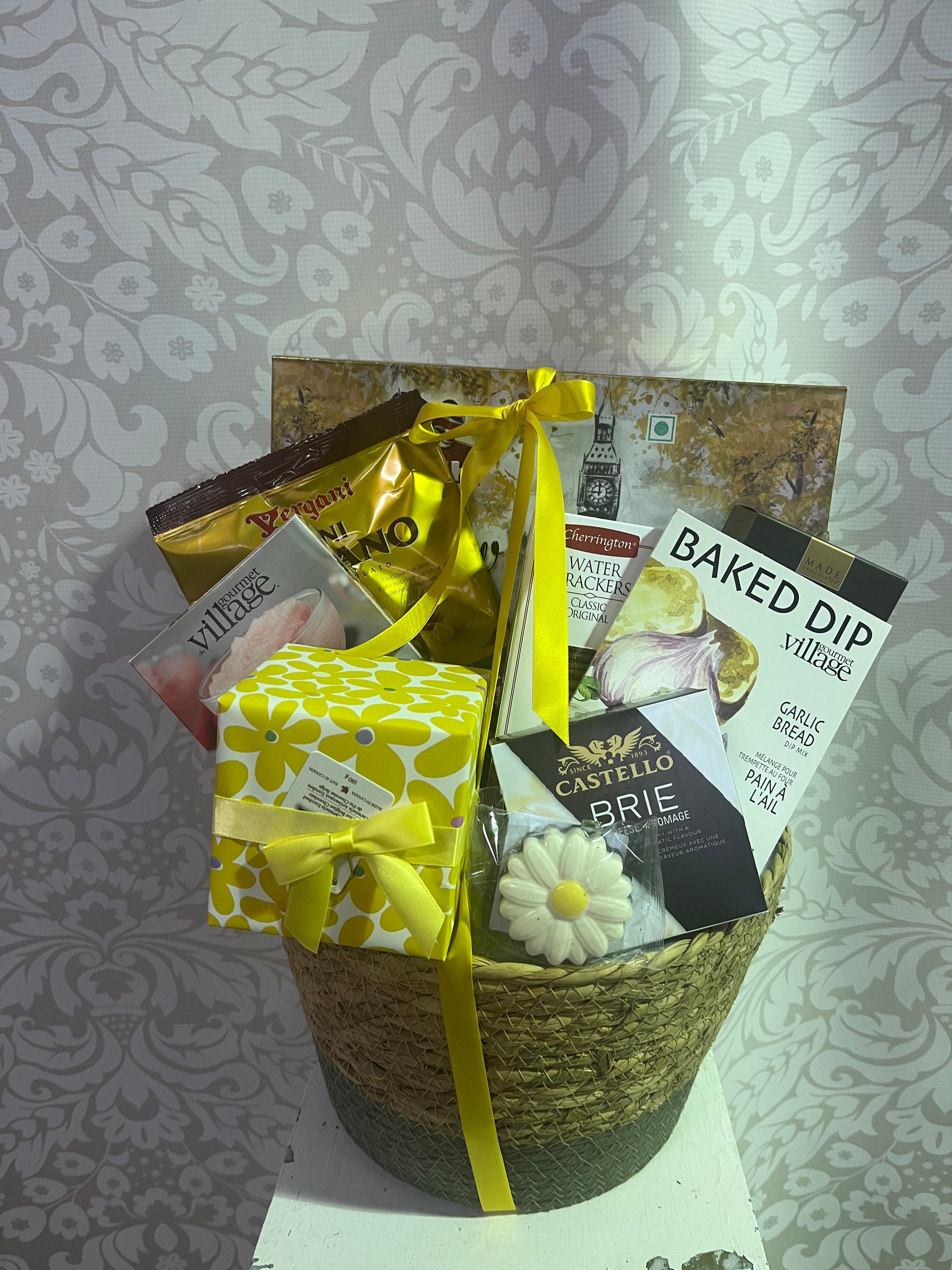 Bring warmth and comfort with the Burst of Sunshine Gift Basket, a bright and inviting gourmet gift filled with sweet and savoury favourites. This basket includes brie cheese, crispy crackers ,strawberry daiquiri mix, Gourmet du village bake dip, cookies, Italian chocolate a delightful